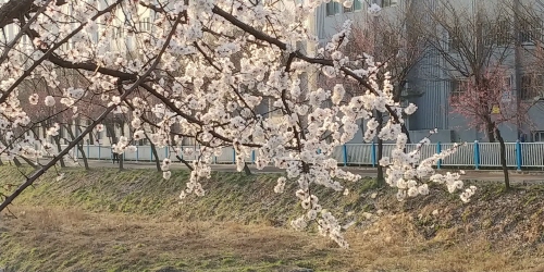 아침 출근길, 가경천변에 살구꽃이 피었네요.