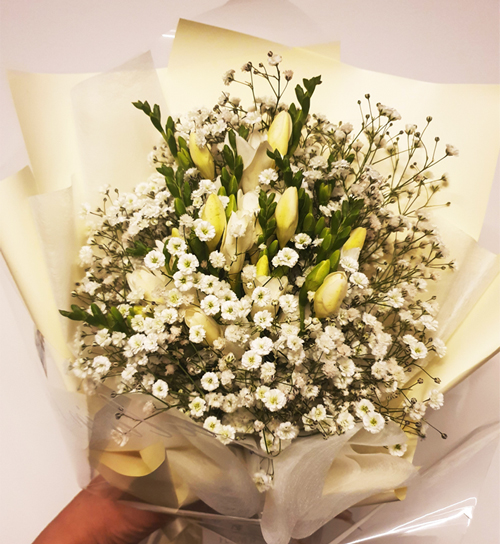 늘 노란 프리지어였는데 올해에는 하얀 프리지어를 사다 줘서 색다른 기분이었어요.