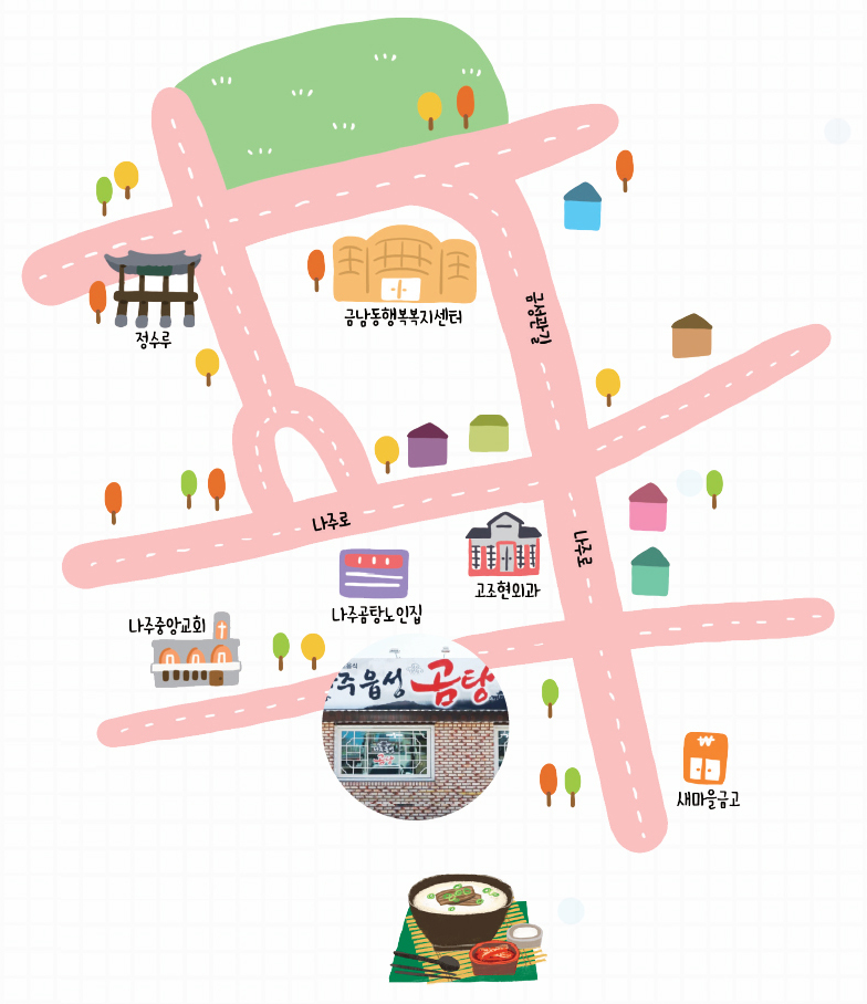 현재 나주답사 1번지인 금성관 인근으로 나주 대표음식인 곰탕거리가 조성되어 있다. 하얀집, 노안곰탕, 남평할매곰탕 등 전통 있는 음식점이 많이 위치해 있어 구미에 맞는 식당을 방문해서 나주곰탕을 즐기면 된다.