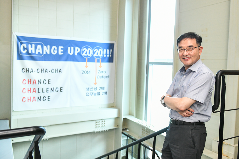 ▲ 현장에 걸린 체인지업 표어 앞에 선 조석현 대표이사