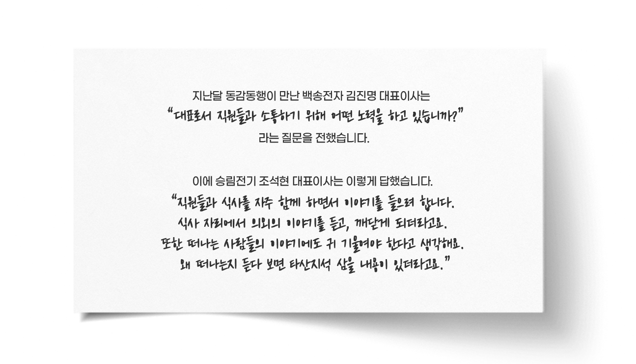 승림전기의 조석현 대표이사와 임직원들의 돈독한 관계로 짐작할 때, 큰 태풍이 오더라도 잘 헤쳐나가라는 확신이 생깁니다.