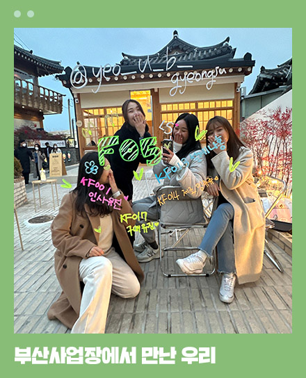 12월 10일, 1박 2일로 경주 여행을 떠난 입사 동기 네 명입니다. 서로 업무적으로도 도와주고 힘들 때 응원도 해주며 정말 돈독한 사이가 되었습니다. 경주 황리단길의 한 카페를 가니 보드마카로 거울을 꾸밀 수 있게 되어 있더라고요. 부산사업장을 의미하는 F05와 각자 담당하고 있는 부서 코드를 적어 재미난 사진을 남겨 보았습니다. LS ELECTRIC에서 맺은 소중한 인연을 앞으로도 쭉 이어 나가고 싶습니다.