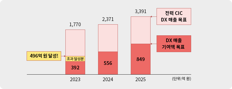 우리 회사는 미래 신성장 동력 확보를 위해 ‘2025년 DX 매출 비중 25% 달성’이란 목표를 수립하고 DX 사업을 펼치고 있습니다. 이를 위해 청주)Digital Solution팀은 DX 매출 증대에 기여할 수 있도록 기술영업 활동을 통해 프로젝트 수주를 지원하고 있으며 2023년 392억 원, 2024년 556억 원, 2025년 849억 원의 DX 매출 기여를 목표로 하고 있는데요. 올해는 496억 원을 달성해 목표 대비 126%에 이르는 성과를 냈습니다! 삼성바이오, LGU+ 등 타깃 고객 프로젝트 수주, FEMS(Factory Energy Management System) 리스, 스마트 팩토리 등 DX 사업의 프로젝트 수주 영업 지원, 베트남, 러시아, 중동 등 해외 법인 DX 사업 Spec-in 및 기술 지원에 전력을 다한 결과입니다.
