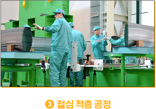 가공된 규소 강판을 전기 자속이 발생할 수 있는 자기 회로 구성을 위해 적층하는 공정입니다. 얇은 규소 강판을 쌓으면 한 덩어리로 된 구조물보다 전류 손실을 줄여 변압기의 효율을 높일 수 있습니다.